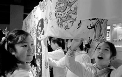 一位小学生对戏服袖子上的刺绣很好奇,叫她同学也过来看