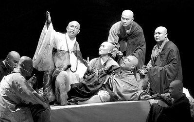 《鉴真东渡》的创作历时三年,由青年编剧罗周执笔,年近七旬的导演熊源伟执导,徐坚强作曲。全剧12个角色均由上戏教师和学生扮演。其中,宋怀强在连续担任了话剧和音乐剧《弘一法师》主演之后,此次又饰演鉴真,因此,昨晚演出前,被熟悉者戏称为“专业僧人”。宋怀强自言:“我属半路出家。鉴真55岁决意东渡,我今年55岁,在舞台上体验高僧的宽宏心态,确实颇有感悟。”由于男性角色均为僧人,故剧组在选拔演员时提出要求,在排练和演出期间必须不戴头套剃光头。据悉,该剧在太仓大剧院进行合成排练以来,包括导演在内,男性演职人员的头顶均保持“寸草不留”,不顾闷热天气,经常僧袍加身穿行于舞台上下,让光顾剧院的观众恍若进了寺庙。