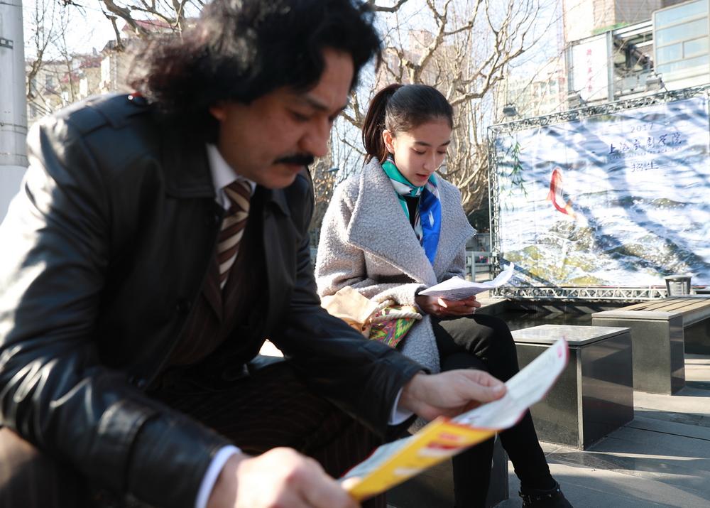 参加八点考试的第一批考生已入场,场外是下一场的考生。其中这一对是在上海追求各自艺术梦想的父女,父亲正在上音求学,女儿则希望在上戏圆梦。
