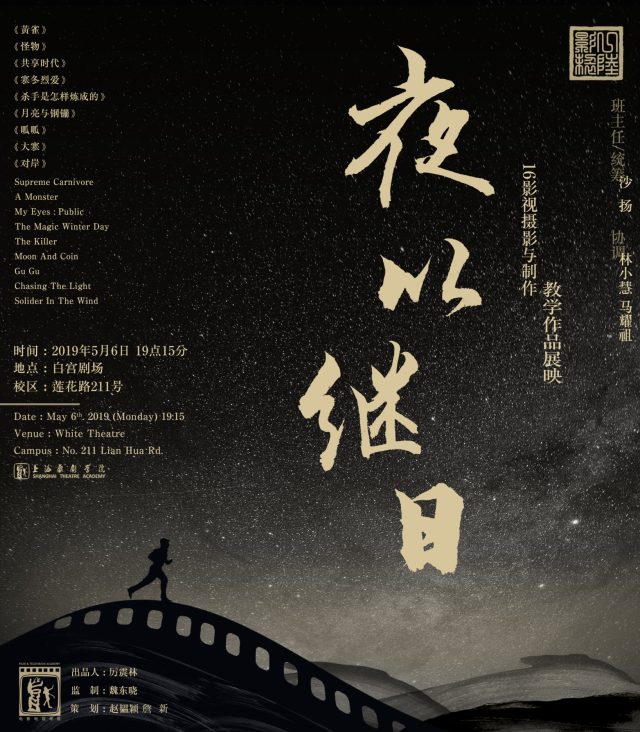 5月6日晚,我校电影电视学院2016级影视摄影与制作班在莲花路校区白宫剧场举办了教学创作优秀短片展映。展映名《夜以继日》,取自于《孟子》:“仰而思之,夜以继日。幸而得之,坐以待旦。”寓意为每位同学勤奋学习、勇于实践、积极思考、不断成熟。