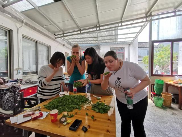 第二天的西山采茶之旅无疑是这次活动的点睛之笔。清早大家在当地茶农的带领下,带好装备,背上竹篓,变身“国际茶农”,深入西山茶园。漫山遍野的绿色让同学们沉浸在田园的自然之美中,忘记了城市的喧嚣和繁重的学习压力,深吸一口气,满满茶香,大家与采茶者一路互动,学习茶叶的种植和采摘。待到茶农传授完采摘经验,学生们已经迫不及待地分散到茶园的各个角落采茶,采茶结束后,带着各自精心采摘的新鲜嫩茶,同学们又跟着制茶师学习如何拣茶和炒茶,只见制茶师双手在高温的铁锅里不停地上下翻动,一股茶叶的清香随着蒸腾的热气弥散开来,看似动作简单,同学们一个个跃跃欲试,但结果不是被烫到,就是把茶叶甩到了锅外,都败下阵来。如此这般,循环往复,一个多小时后,鲜叶内的水分渐渐被去除,青绿色的茶叶逐渐变成暗绿色,经过上千次翻动,茶叶终于炒制完成,散发出阵阵清香,捏一小撮放进茶壶,泡上开水,茶叶随着水流旋转着下沉,叶芽伸展,在水中展现出自己嫩绿透亮的美丽姿态,静待片刻,轻轻抿上一口,让人回味无穷。这次接触和了解茶叶制作工艺的机会对留学生们来讲是个难得和珍贵的体验,同学们亲自体验采茶,制茶的全过程,不但深刻体会到其中的乐趣与艰辛,也近距离感受到中国茶文化的魅力。