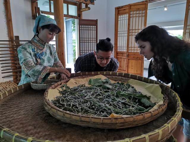 活动为期两天,第一天师生们参观了位于苏州市内的苏州丝绸博物馆,苏州丝绸博物馆是中国第一座丝绸专业博物馆,以弘扬丝绸文化、保护丝绸文物、传承丝绸技艺、传播丝绸知识为宗旨。馆内既有精美的丝绸文物陈列,动态的栽桑养蚕展示,又有传统织机操作表演和现代丝织技术在生活上的应用。博物馆以年代的形式进行陈列,分“古代丝绸馆”与“现代丝绸馆”两个专题展区,从不同角度表现苏州丝绸的伟大成就。馆内展区展品精致、氛围浓郁,给留学生们留下了深刻的印象。在参观的过程中,留学生们亲身体验了馆内的场景模型,身临其境地感受到了每件丝绸制品所处时代的精神风貌,对中国传统丝绸文化与技艺惊叹不已。