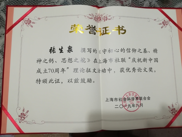 近日,我校张生泉教授撰写的《守初心的信仰之基、精神之钙、思想之舵》在上海市社联“庆祝新中国成立70周年”理论征文活动中,获优秀论文奖。(文、编辑:榕树)