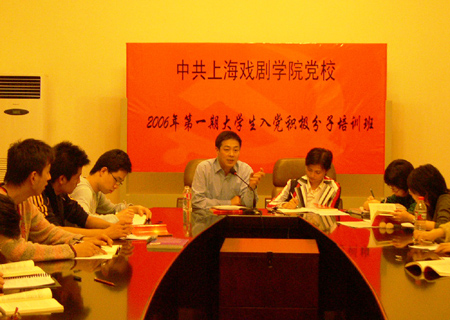 5月11日晚,上海戏剧学院2006年第一期大学生入党积极分子培训班在熊佛西楼会议室正式开讲。本期党训班共有46名学生参加,听课人数高于以往历届党训班,体现了我院大学生较高的政治热情。学生处处长邱中岳老师首先在党训班上做了课前动员,希望每位学员通过党训班的学习,做到“抓理论”、“讲政治”、“精业务”、“做一名积极分子”四点要求。随后,邱老师为学员们讲授了“中国共产党最高纲领与最低纲领的辩证统一关系”,党训班第一课正式开讲。本期党训班将历时一月。