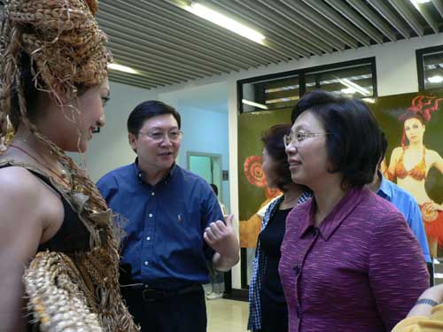 2006年5月31日下午,中共上海市委副书记殷一璀一行来我院视察,在我院党委书记贺寿昌的陪同下饶有兴致地参观了02级服化专业的毕业作品展示。殷一璀对“着色”艺术造型展示表现出浓厚的兴趣,关切地向老师和同学们询问了制作工艺及技法,并对同学们的创新思维和动手能力表示了赞赏。