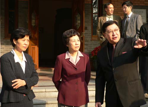 图为我院党委书记贺寿昌向教育部评估专家组组长、中央文化管理干部学院副院长嬴枫,上海市人民政府副市长严隽琪介绍我院发展近况