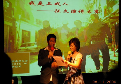 在主持人清晰而精准的说明了比赛规则之后,大屏幕上显现出了第一位选手,来自莲花路校区,06群文的胡婷婷同学。她深情而投入的演讲迅速在新空间的上空积聚起一股滚滚的激情蜜意。随后陆续登台亮相的11位来自不同系别年级的选手,各显神通,在小小的演讲台前倾情宣泄着自己内心深处对上戏这个温馨家园的热爱与祝福。他们的演讲忽而慷慨激昂,忽而柔美雅致,忽而抑扬顿挫,忽而真切朴实。讲台上光彩熠熠的他们此时正是十二位上戏人的楷模,展示着十二个风采各异的美丽舞台,就像是绚烂多姿的上戏校园。在这股激荡的热力中,载着毕业生们对上戏家园无限的眷恋与感激,闪着新生美好的憧憬与梦想。