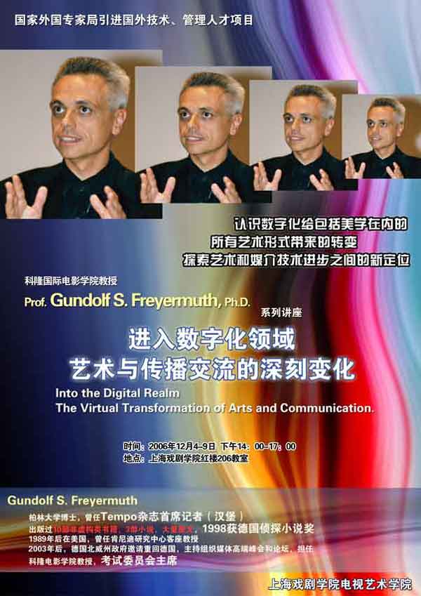 日前,上海戏剧学院电视艺术学院邀请到柏林大学博士、曾任Tem杂志首席记者、出版过10部非虚构类书籍、3部小说、大量散文、1998获 德国侦探小说奖;1989年后在美国,曾在肯尼迪研究中心当客座教授;2003年后,应德国北威州政府邀请重新回到德国,主持组织媒体高端峰会和论坛,担任科隆电影学院考试委员会主席的Gundolf S. Freyermuth 教授,从12月4日起,连续五天,下午14:00-:17:00在红楼206教室,作题为《进入数字化领域艺术与传播交流的深刻变化》的系列讲座。