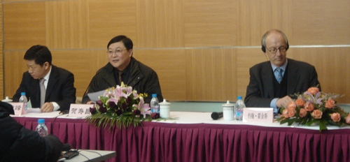 图为:(左起)浦东新区宣传部副部长刘豫峰、我院党委书记贺寿昌、创意产业专家约翰・霍金斯在主席台上