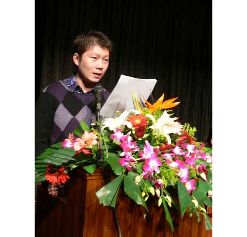 图为“三好”学生及优秀学生干部代表木偶04级赵峰同学在表彰大会上发言