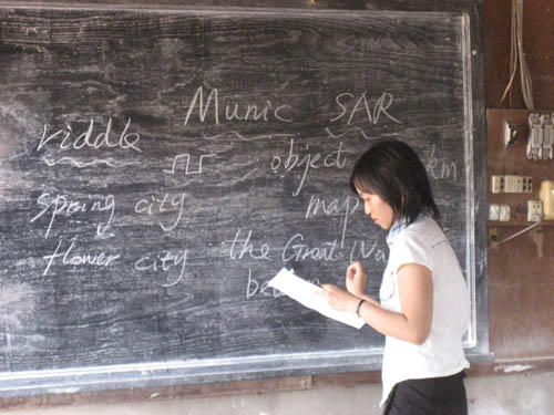ONE WORLD,ONE DREAM,这是北京2008奥运会的口号。学生们在我的启发下讲述各自的梦想,整个课堂交流气氛甚好。特别是最后的游戏环节,请一个学生模仿某个运动项目动作,另一个学生用英语说出它的名字。游戏互动引起了学生们的兴趣,也激发他们记忆新词汇的能力。一堂课很快结束,我略微舒了口气。不敢懈怠,因为我知道还存在不少问题。比如老挝学生的英语带有口音,自己还不能清晰理解,交流有一定困难;比如我对一些问题用英语解释得还不够清楚,口语能力需要提高……迈出第一步是好的,在总结中不断进步。学生们给予我的肯定给了自己很大的信心,加油!