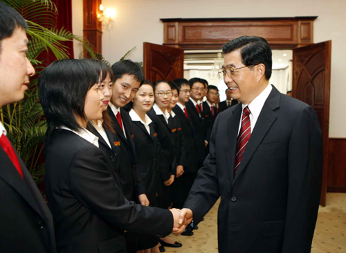 2006年11月20日下午,胡锦涛总书记在老挝党中央贵宾楼接见第六批中国青年志愿者赴老挝服务队全体队员。我院青年教师徐莹(前排左三)、校友叶长海(后排右一)作为第六批中国青年志愿者受到胡锦涛总书记亲切会见。