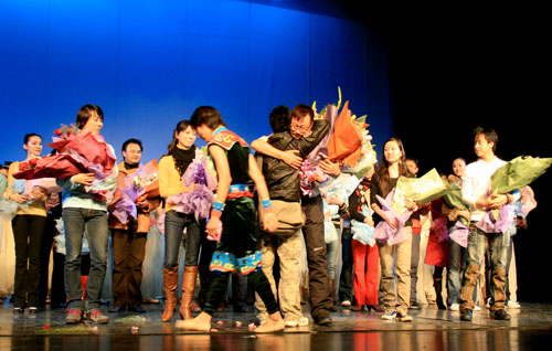 伴随着观众热烈的掌声和喝彩,汇报演出落下了帷幕。上海戏剧学院主持工作的副院长韩生、副书记副院长葛朗、副院长孙惠柱、刘志刚以及舞蹈学院领导上台祝贺演出成功并所有的师生表示慰问。各位领导对于全体同学四年的努力和今天的表演欣喜不已。同学们将一束束的鲜花争相献给了辛勤培养他们的各位亲爱的老师。他们紧紧拥抱着老师们,感激的心情就在那一刻泪如泉涌。许多学生的父母从外地赶来,有的甚至是祖父母、父母四位家长一起来看演出,他们包含着激动的眼泪看完演出。他们都纷纷表达了一个声音:感谢学校、感谢老师、感谢领导为我们的孩子创造了这么好的学习条件,将孩子培养成材。一位学生的祖母深情地对舞蹈学院的领导说,四年前是我亲自送孙女到上戏来上大学的,太感谢你们了,把她培养的这么有出息。