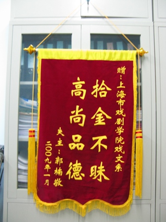 近日,一位满面笑容的先生走进戏文系办公室,手中捧着一面锦旗和一封感谢信,锦旗上写着“拾金不昧、高尚品德”。原来,这位先生姓郭,郭先生在1月2日晚不慎将一个装有六千元现金的钱包遗失,钱包内还有装有很多重要证件,就在他心灰意冷时,我院戏文系08级艺术教育专业的周可凡同学通过包内证件,冒着寒风、几经周折,终于将钱包归还到失主手中。