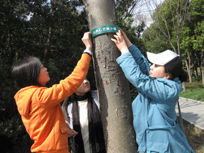 启动仪式结束后,各院系同学,按照印制有姓名的标牌,在指定的区域内为自己选好的树木挂牌。整个挂牌活动持续了一个多小时,挂牌过程中,同学们认真细致,尽量不践踏草坪,尽量不伤害到正在返青的树木。在近100颗被认养的树木中,既有以教师、学生个人身份认养的,也有以班级、团体名义认养的,体现了近年来上戏学子的环保意识不断增强。同学们也纷纷表示,希望以后能有更多的机会、以更丰富的活动形式参与到环保、世博当中。(文:艺管06 苏杭;图:艺教08 郑丝丝)