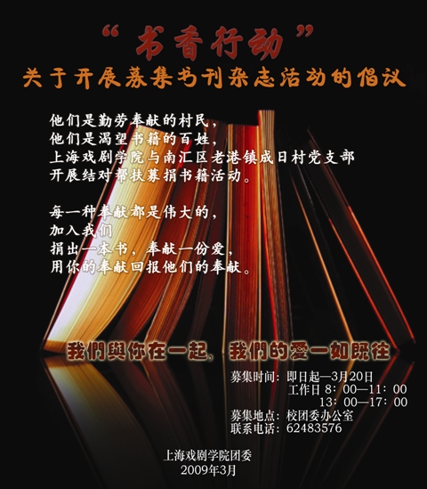 即日起至3月20日(双休日除外),早上8:00-11:00;下午13:30-17:00上海戏剧学院与南汇区老港镇成日村党支部开展结对帮扶募捐书籍活动。