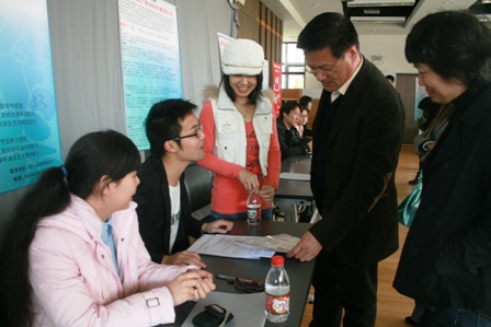 副院长葛朗、学生处副处长徐咏在招聘会现场与用人单位亲切交谈,深入了解用人单位意见