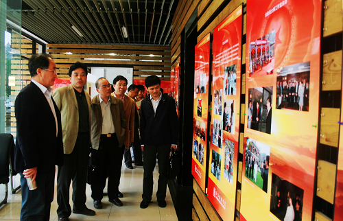 图为指导检查组领导在刘志钢副院长陪同下观看展览