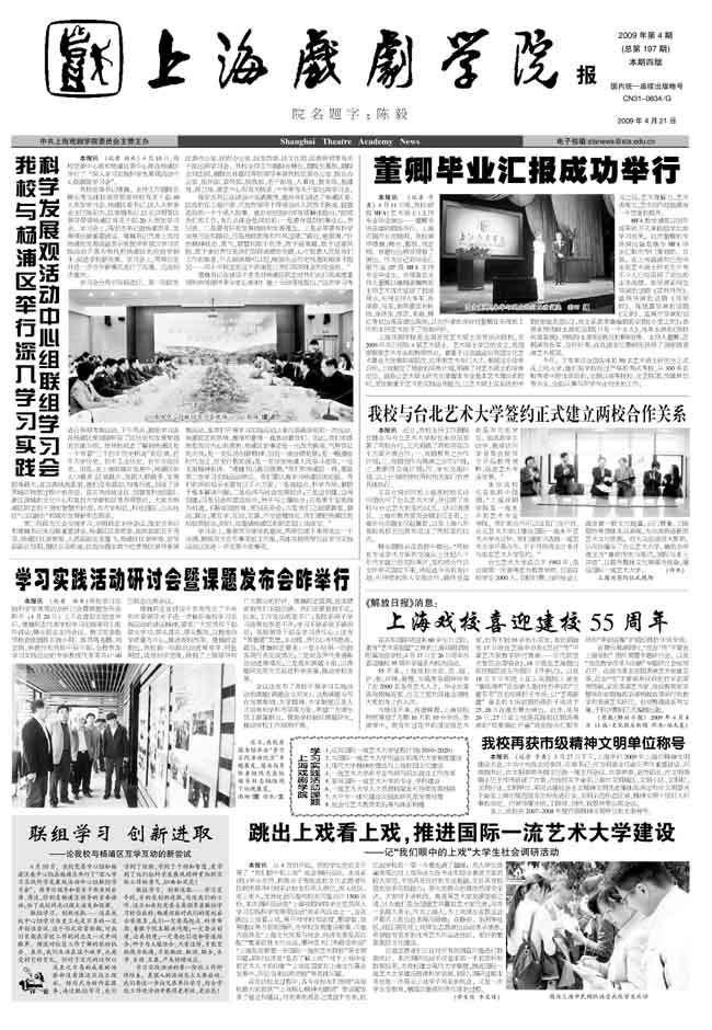 《上海戏剧学院报》2009年第4期已出版(总197期)已于2009年4月21日出版。本期重点内容有:《我校与杨浦区举行深入学习实践科学发展观活动中心组联组学习会