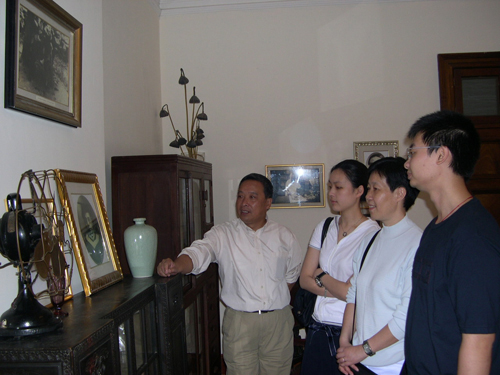 图为2005年熊佛西女儿熊小泓率女和熊佛西孙子熊梦楚一起在我校基建处处长、展览馆设计范和生老师(左一)陪同下参观熊佛西展览馆。(摄影:白水)