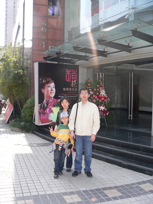 图为朱先生一家在端均剧场前合影留念(摄影:一品)