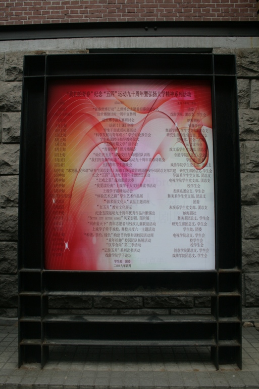 今天是5月4日,是五四运动九十周年纪念日。五四青年节期间,我校团委、学生处组织开展“我们的青春”纪念“五四”运动九十周年暨弘扬大学精神等丰富多彩的纪念和宣传教育系列活动。