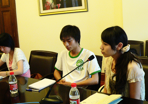 图为我校四川籍学生代表刘飞、肖凝佳在座谈会上