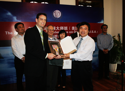 图为美国领事馆文化官员俞天睽与我校主持工作副院长韩生互换礼品