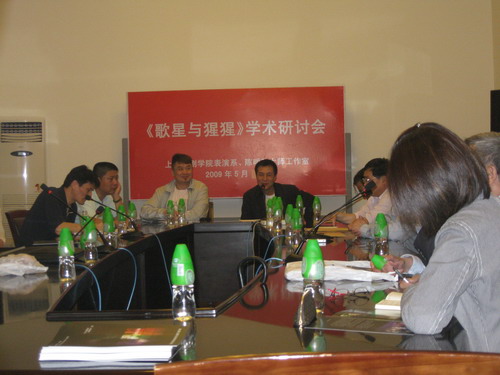 5月20日下午1:30,表演系06级音乐剧班实习大戏《歌星与猩猩》学术研讨会在佛西楼会议室召开。主持工作副院长韩生,表演系系主任龙俊杰、党支部书记张生泉、副系主任何雁,有关专家陈明正、张仲年、陈加林、刘志新,上海话剧艺术中心杨绍林、周小倩,以及《歌星与猩猩》编剧赵耀民、导演洪彬、作曲张博和表演系06级音乐剧班全体同学,一同出席了研讨会。研讨会由何雁老师和洪彬老师共同主持。