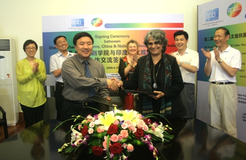 昨日中午,我校与印度国立戏剧学校合作交流签约仪式在佛西楼会议室举行,主持工作副院长韩生代表我校与印度国立戏剧学院代表Anuradha Kapur院长共同签署并交换了两校合作交流协议。校党委书记楼巍、副院长孙惠柱、外办主任金永林、外办主任助理张芸蕾共同出席了签约仪式。