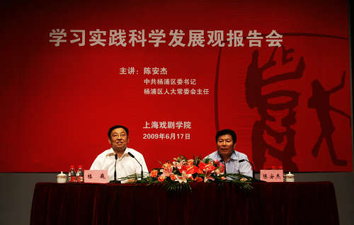 在我校华山路校区端钧剧场,陈安杰同志为我校师生作了学习实践科学发展观专题辅导报告。报告结合杨浦区改革发展实例,既高屋建瓴,又深入浅出,充分展示了杨浦人民在区委、区政府的领导下改天换地、锐意进取的精神和品格。报告长达2小时,受到在场师生的一致好评,也给我校广大党员干部自觉学习实践科学发展观上了生动的一课。