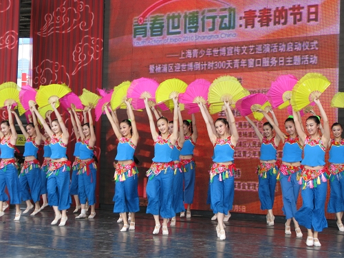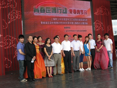 7月5日上午,六十余名师生文化志愿者参加了由团市委、杨浦区委、区政府等部门联合主办,兴业全球基金支持的“青春世博行动:青春的节日――上海青少年世博宣传文艺巡演活动启动仪式暨杨浦区迎世博倒计时300天青年窗口服务日主题活动”。带去了《祖国我为你干杯》《蝴蝶春情》《咏荷》等精彩的歌舞节目,宋颂、周艳霞等老师,舞蹈学院、戏曲学校的几十名同学们先后登台表演。