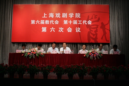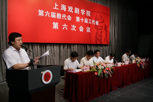2009年7月15日下午13:00,上海戏剧学院第六届教代会、第十届工代会第六次会议于端钧剧场召开。党委书记楼巍、主持工作副院长韩生、副院长葛朗、副院长刘志钢、副院长孙惠柱、工会常务副主席谢建平、工会兼职副主席卢昂在主席台就座。会议由副院长、工会主席葛朗主持,正式代表118人、列席代表34人、特邀代表2人参加了会议。