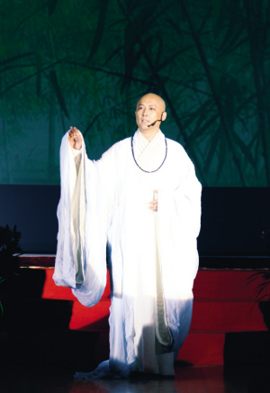 在去年排练话剧《弘一法师》时,宋怀强练了钢琴、风琴、舞蹈、京剧,甚至扮花旦学唱《贵妃醉酒》。如今,出演多媒体音乐剧《弘一法师》似乎让他有了更深刻的体悟,他毅然选择暂入空门,剃度为僧,全身心地投入到角色中去。