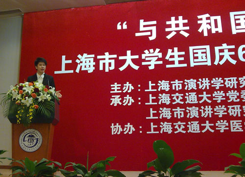 编者按:由本校担任主任单位的上海市演讲学研究会高校工作委员会10月21日与上海交通大学宣传部一起在交大医学院承办了“与共和国同行”2009年上海市大学生演讲比赛。我校电视艺术学院主持专业07级学生刘哲源在学校宣传部组织下、在专业老师辅导下,以“电视艺术放送新中国风采”为题参赛并获得了二等奖。《解放日报》、《文汇报》和上海电视台分别刊发了有关报道。下面刊登的是《文汇报》的报道。