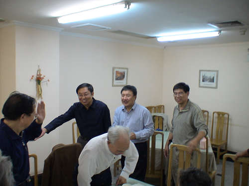 图为学校领导楼巍、韩生向退休教职工祝贺生日