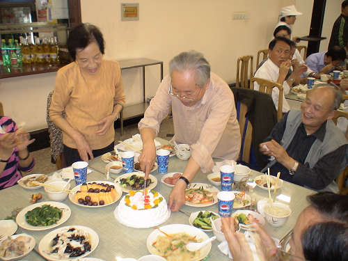 图为退休教职工分享生日蛋糕