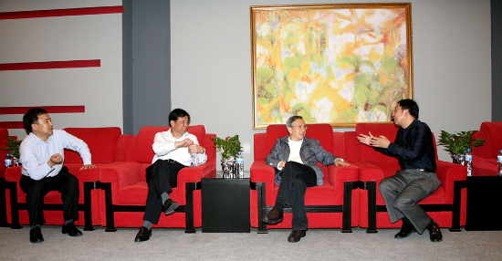 图为开演前,上海市人大常委会主任刘云耕(右二)、上海警备区司令员江勤宏少将(左二)与我校党委书记楼巍、院长韩生亲切交谈