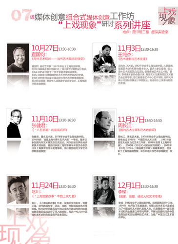 07级组合式媒体创意工作坊由查国钧教授担纲,虽然一开始并没有明确的教学模式,但很早就明确了工作坊的主题是“我眼中的‘上戏现象’”。“上戏现象”是个极有意思的话题。它指的是上戏这个不以专门培养绘画人才为目标艺术院校出现了很多活跃在当代艺术领域的艺术家,这个群体集中在上世纪七八十年代在上戏求学的一批学生当中。为什么会出现“上戏现象”,这与时代背景、上戏当时的系科设置和教学模式、师资、生源、学风甚至海派文化的影响等多方面因素都有关联。选择这个主题,就是试图让学生通过和“上戏现象”代表人物对话,观摩他们的艺术创作获得实感,通过自己对这个有趣现象的爬梳,提出独立的见解,培养他们自己独立思考的能力,同时也让他们理解上戏自身的传统,最后由学生围绕“我眼中的‘上戏现象’”这个主题自主策划并创作作品向社会公众发表和展示。