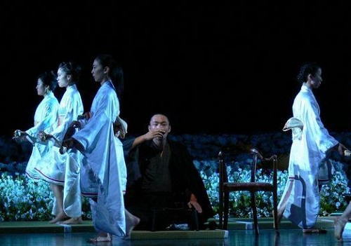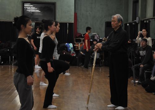 铃木忠志给人的第一印象是一位很慈祥的老爷爷,满脸的笑容,说话很和善,经过互相自我介绍了以后,很快就进入了课题,这时体现了铃木忠志先生的严格和他的学生的认真。他教学的三个点主要是:1制造能量,2调节呼吸,3支配重心。铃木先生让我们做了些练习,第一个练习,是在日本民族式的音乐中我们有节奏的踏步。踏步的时候上身自然垂直不能晃动,一样的节奏下全脚掌直接往下落地,做这个练习脚会很痛很痛,在做这个练习之前铃木先生就告诉我们做这个练习如果脚不疼那就是没有认真做。能量,氧气,重心都不是肉眼能看见的,所以在我们的日常生活中也没有受到重视。但是,其中任何一项发生问题都会对我们现代社会中的个人生活和社会生活有很大的影响。这三项功能其实是互相关系的,要生产更多的能量,身体就需要更多的氧气,也就会因此而加强呼吸,通过铃木先生教的这些练习来个别强化这三个功能,我们生命力也会更强。