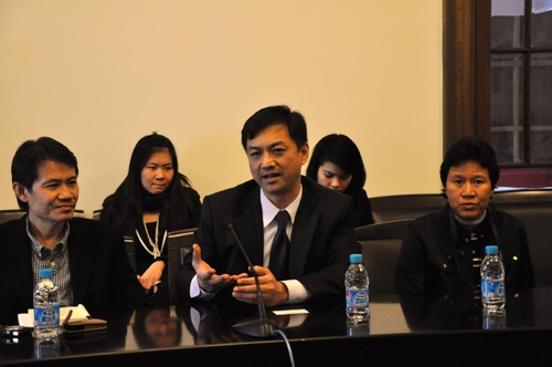韩院长热情欢迎泰国专家一行的到来,对我校与泰国开展国际间交流与合作表达了美好的祝愿,并预祝即将召开的研讨会圆满成功。泰王国驻沪副总领事牛泰蓬・康卡贺兰对韩院长的欢迎表示感谢,并表达了交流合作的共同心愿。