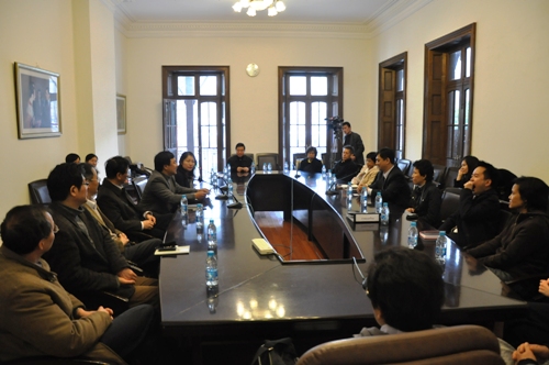 今天下午3点半,韩生院长在佛西楼会议室亲切会见了由泰王国驻沪副总领事牛泰蓬・康卡贺兰(Mr.Nathapol Khantahiran)带领的泰国专家一行十余人。我校张仲年教授以及研究生部主任宫宝荣、科研处处长姚扣根、教务处副处长厉震林、科研处副处长王云,外办副主任张云蕾等共同出席了会议。