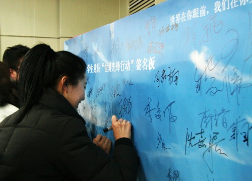 首先,学生党员代表钱隆同学宣读倡议书。倡议书中提到,作为世博一代的大学生应该积极参与世博实践活动,勇于担当历史赋予的责任与使命;积极吸收世博会蕴含的多元文化,不断拓宽艺术视野、激发创作动力;服务世博,奉献青春,共同营造文明世博氛围。在座的同学们纷纷上台在签名版上签名,表示要用实际行动体现青春价值。