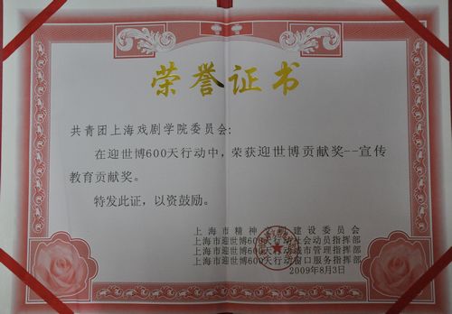 在迎世博行动600天行动中,我校结合实际情况,深入思想发动,坚持真抓实干,注重改革创新,形成整体合力,开展了丰富多彩、扎实有效和充满特色的迎世博活动,在市文明委、市迎世博600天行动指挥部等部门评选的迎世博贡献奖单位中,共青团上海戏剧学院委员会荣获迎世博宣传教育贡献奖。(图文、编辑:谷晴)