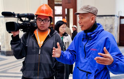 5月4日,《蔡国强:农民达芬奇》大型装置全球首展作为上海外滩美术馆的开馆展,与上海世博会同时举行。浦东震旦大厦的媒体屏幕宣传与之遥相呼应,整个装置展跨浦东浦西,规模宏大。受蔡国强工作室的邀请,我校编导系同学志愿组成的《蔡国强:农民达芬奇》纪录片摄制组也已正式成立。