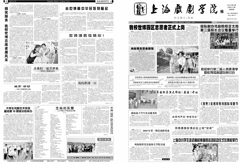 《上海戏剧学院报》2010年第6期已于2010年6月10日出版(总第211期),共四版,本期重点内容有:《我校世博园区志愿者正式上岗》,《向世博志愿者致敬》,《宫宝荣任上海戏剧学院副院长》,《我校新增5名文化发展基金会评审专家》,《2010年国际导演大师班(英国)开班》,《校园网开设“世博专栏”》,《国际剧协戏剧院校亚太局第三届校长会议隆重举行》,《我校举行第二届人类表演学暨教育戏剧国际研讨会》,《<原野>亮相莫斯科国际戏剧节》,《我校成立学生党员服务队》,《2010年第一期党训班结业》,《戏校组织党员赴海关学院交流》,《雨果雕像世博后在上戏“安家”》,《上海中小学生走进高校博物馆活动启动仪式在我校举行》等,敬请关注。也可从校园网主页新闻中心内院报专栏点击下载观看。(图文/谷晴 编辑/谷晴)