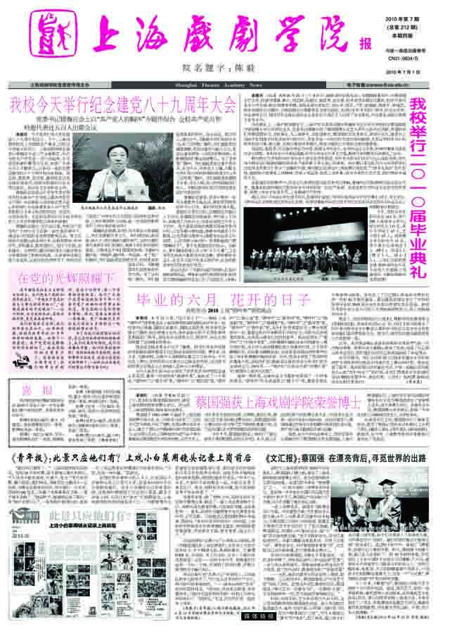 《上海戏剧学院报》2010年第7期(总第212期)已于2010年7月1日出版,本期四版套红。重点内容有:《我校今天举行庆祝建党八十九周年大会》,《我校举行二○一○届毕业典礼》,《我校举办2010上戏“碧叶杯”颁奖晚会》,《蔡国强获上海戏剧学院荣誉博士》,《新西兰电影代表团来我校访问》等,敬请关注。也可从校园网主页新闻中心内院报专栏点击下载观看。(图文/雨田 编辑/雨田)