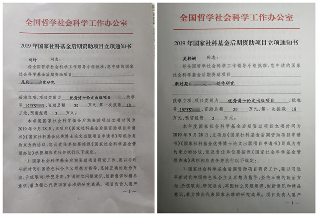 近日,我校2017届博士毕业生刘轩(导师:叶长海教授)、吴韩娴(导师:陆军教授)博士学位论文获2019年国家社科基金后期资助。2019年国家社科基金后期资助项目中艺术学共立项57项,其中重点项目2项,一般项目48项,优秀博士论文出版项目7项。