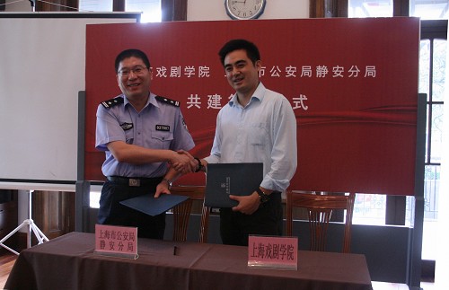 前不久,我校表演系08级李锦飞、王靖两位同学见义勇为救助受伤民警的行为,在全社会引起了较大反响。为进一步深化和谐警民关系建设,加强“警、校”沟通,充分利用双方的有利资源,共同推动两个文明建设,构建和谐社会,我校昨日与上海市公安局静安分局共同签订了警民共建协议书。