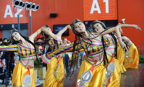 10月1日,上海世博会迎来中国国家馆日。中国国家馆在9米平台的排队等候区滚动推出一场为期1个半小时的精彩演出。来自上海戏剧学院的表演者们“站在中国的舞台上”,用风格纯朴、样式独特、多姿多彩的表演,不仅展示了中国文化的多元,更成就了各国人民难得的心灵对话机会;用不同国家、不同民族精彩纷呈的文化表演,不仅为世博增添欢乐与笑声,更让中外游客感受和体验华夏子女在文化创造中的生命律动,给世博参观者带来美的视觉体验,带来回味无穷的心灵感受。